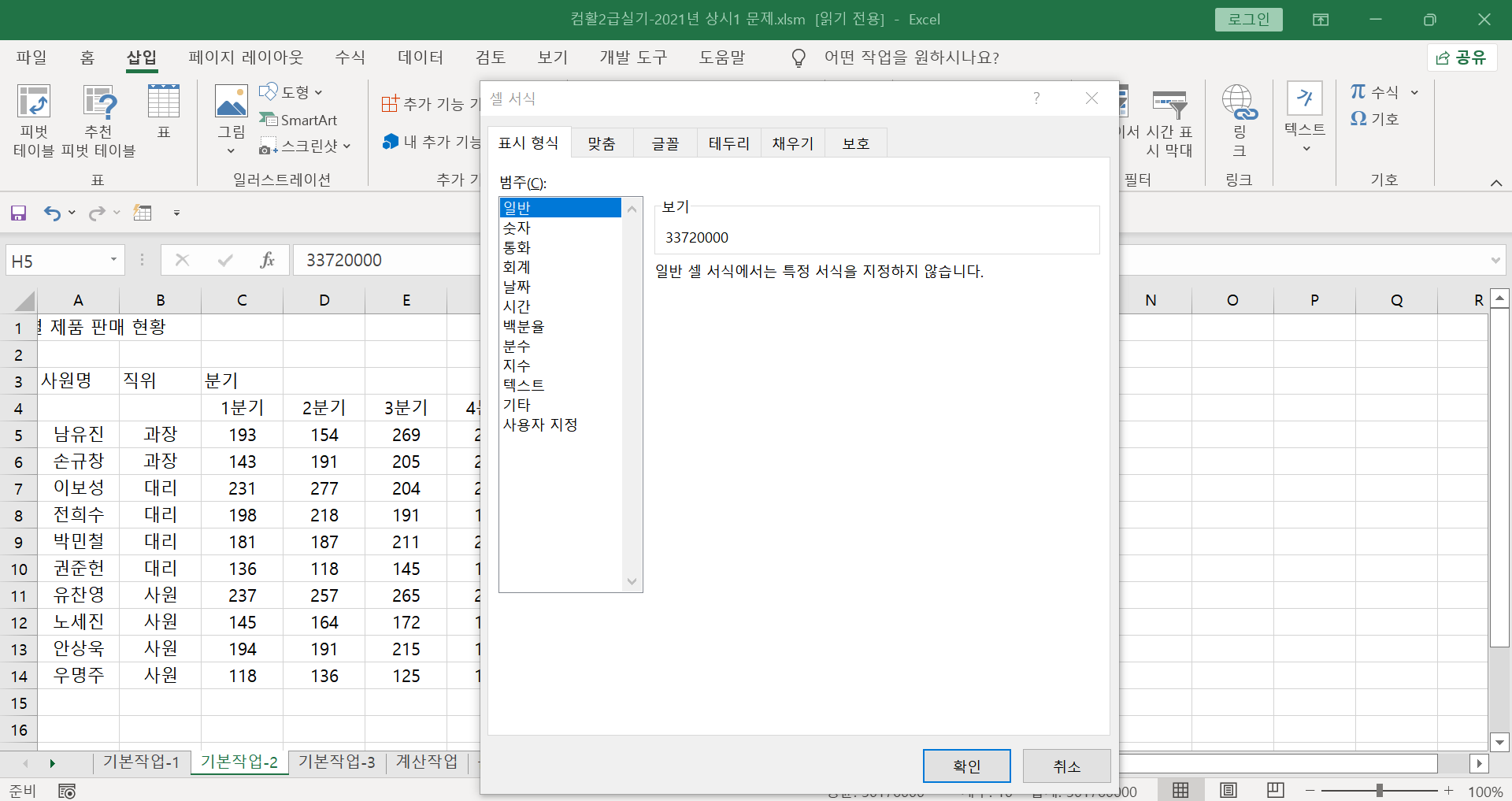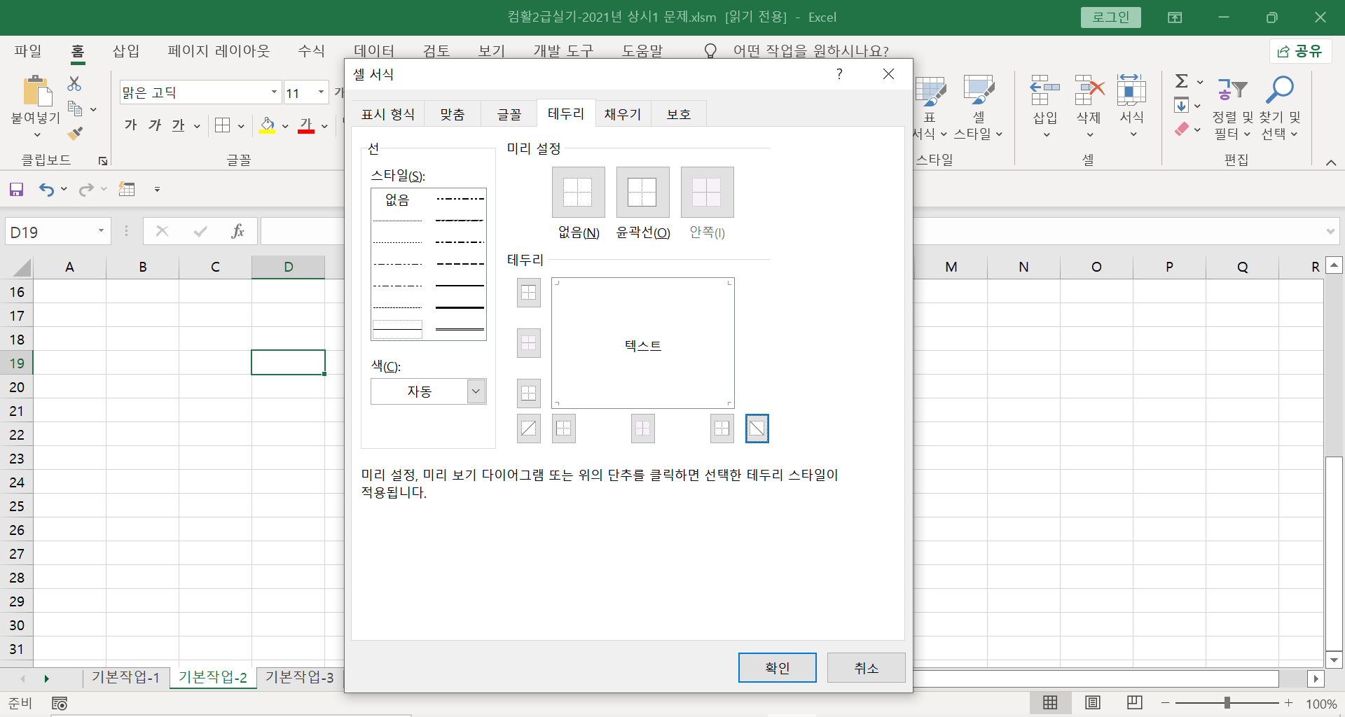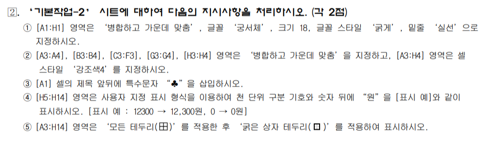 셀 서식 문제는 2점자리 문제 5개가 출제됩니다. 순서는 맨 위부터 하는 것이 문제 푸는데 도움이 되요. 그래서 맨 위 문제부터 차근차근 풀어가기 바랍니다.