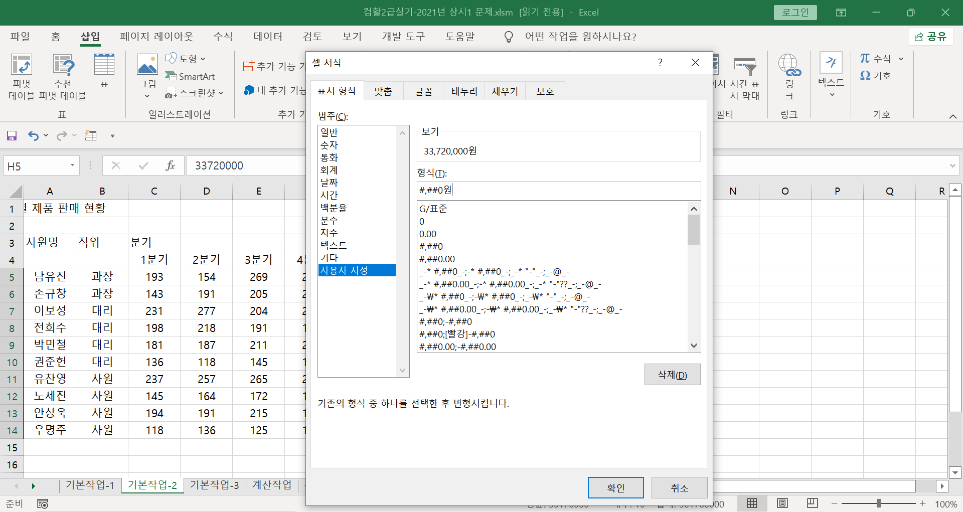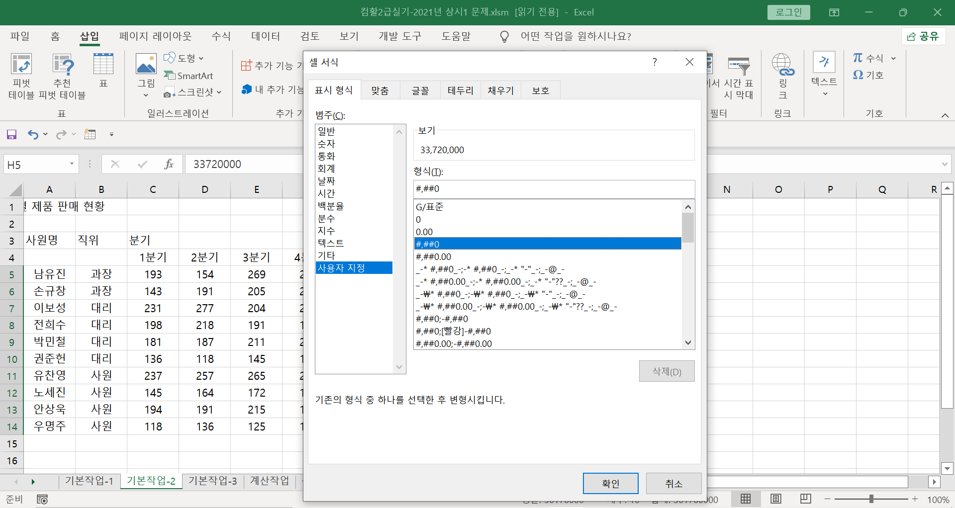 사용자 지정을 클릭하고 천단위 구분 기호인 #,##0을 클릭해줍니다. #,##0은 천 이상의 숫자는 알아서 , 표시를 해주고 0일 경우 0으로 표시됩니다. 이 부분은 컴활 필기 서식 부분에서 중요하게 다루어지는 문제이니 잘 기억나지 않으시는 분들은 필기를 복습해주세요. 서식에 대해 알아야 이 문제를 풀 수 있습니다.