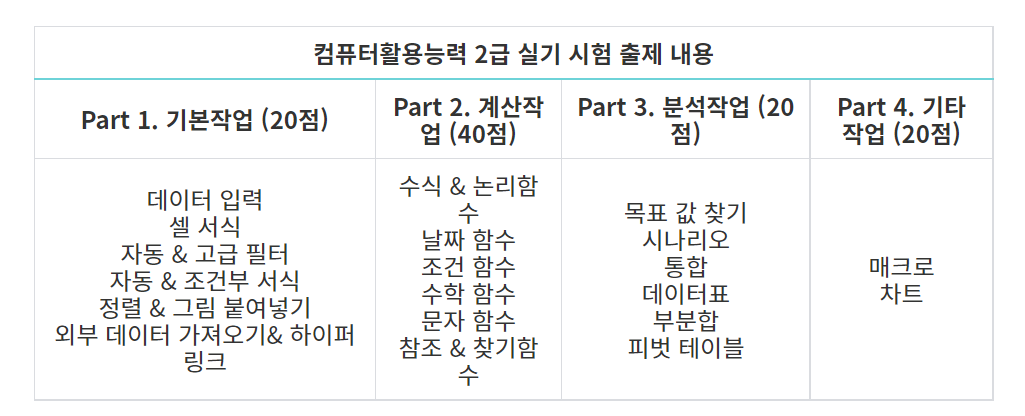 컴활 1급 실기 출제내용도 컴활 2급 실기 문제유형을 기본으로 더 많은 유형이 있습니다. 2021년 개정된 컴활 1급은 기본작업(15점), 계산작업(40점), 분석작업(20점), 기타작업(35점)으로 이전 컴활 1급과 차이가 있습니다.