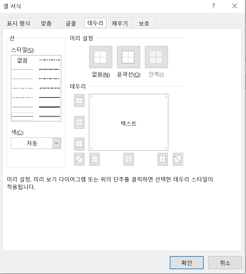 그리고 셀 서식의 테두리 메뉴를 클릭하고 똑같이 /와 반대 /를 클릭해 X를 만들어주면 됩니다.
